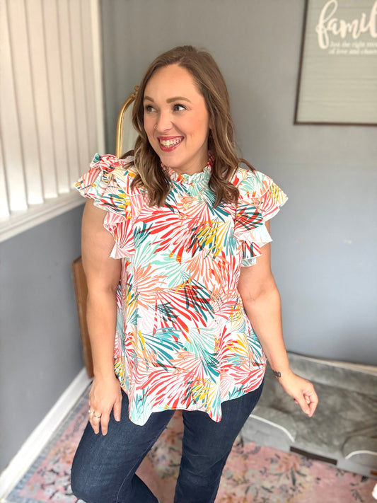 Eyes On You Ivory Abstract Print Frill Neck Double Flutter Sleeve Top