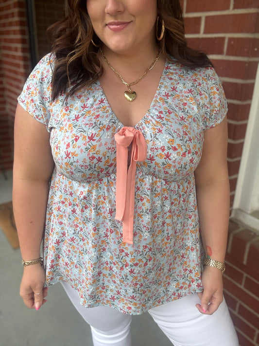 Be Charming Sky Blue Floral Print Elastic Neck Ribbon Tie Top