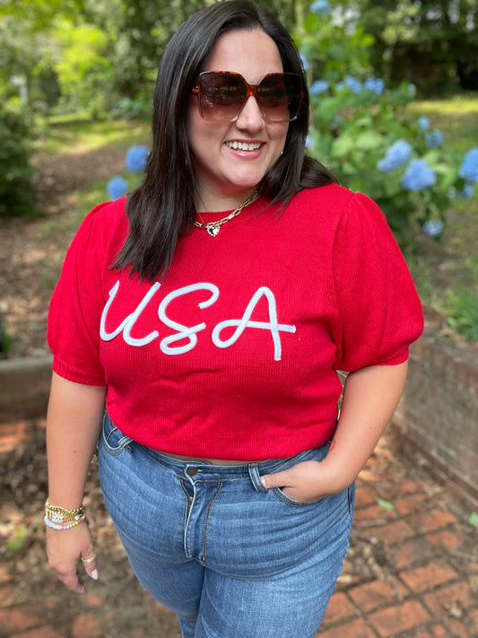 Patriotic USA Red Knit Embroidery Puff Sleeve Sweater Top