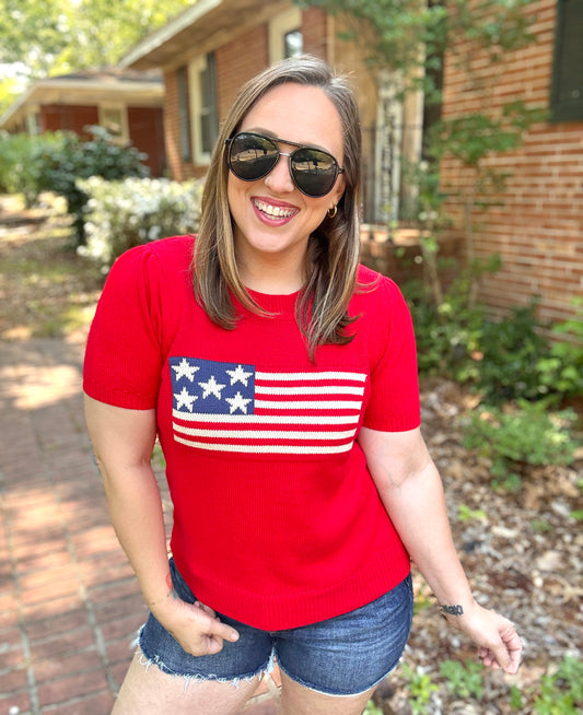 American Flag Bubble Short Sleeve Jacquard Sweater Knit Pullover