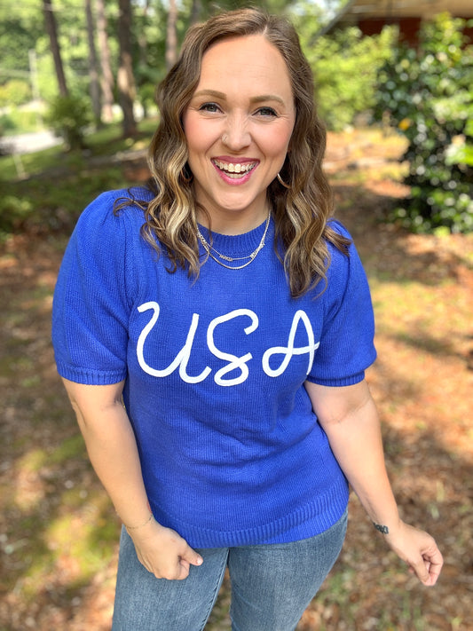 Patriotic USA Blue Knit Embroidery Puff Sleeve Sweater Top
