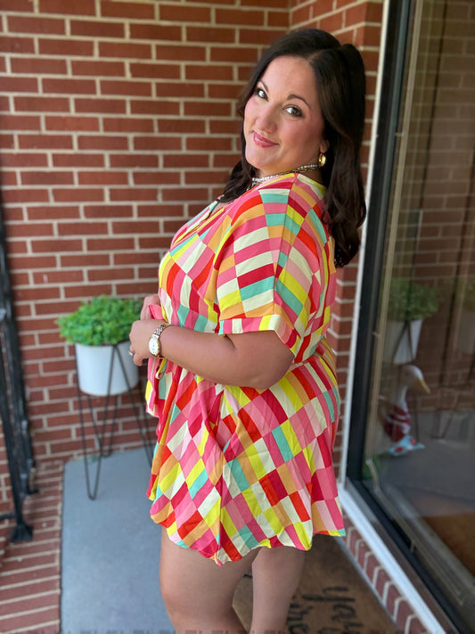 Eyes On You Coral Geo Abstract Surplice Woven Romper