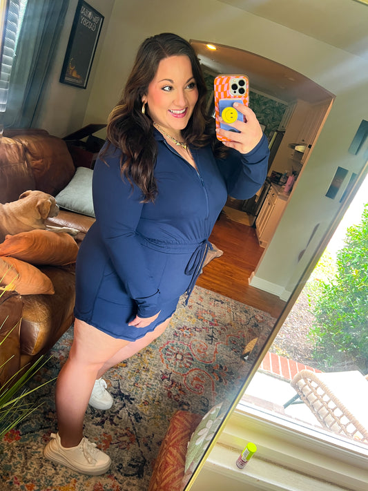 Getting Out Long Sleeve Hoodie Romper in Navy