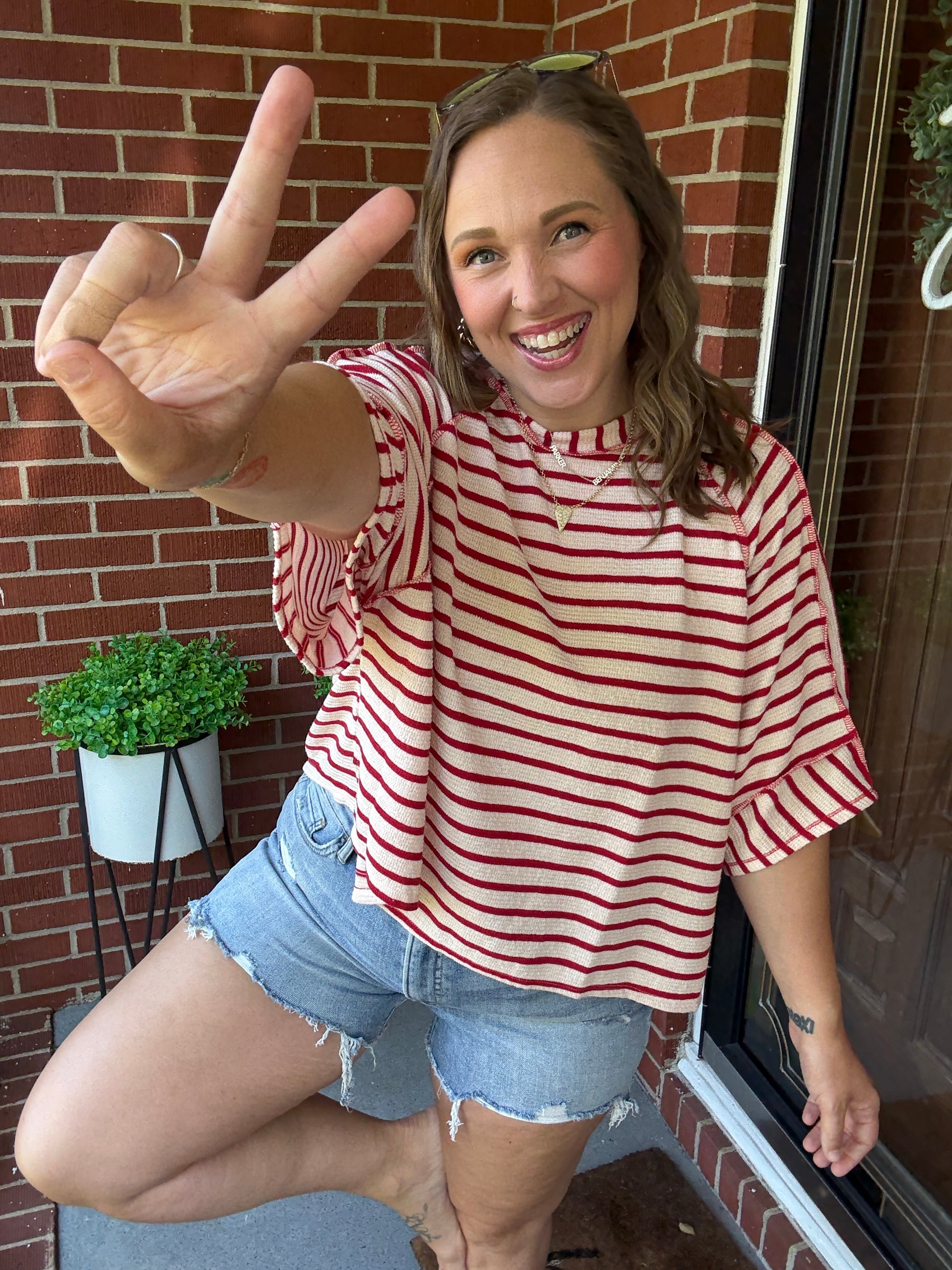 Casual Chic Cotton Red & Cream Stripe Raglan 3/4 Sleeve Pullover