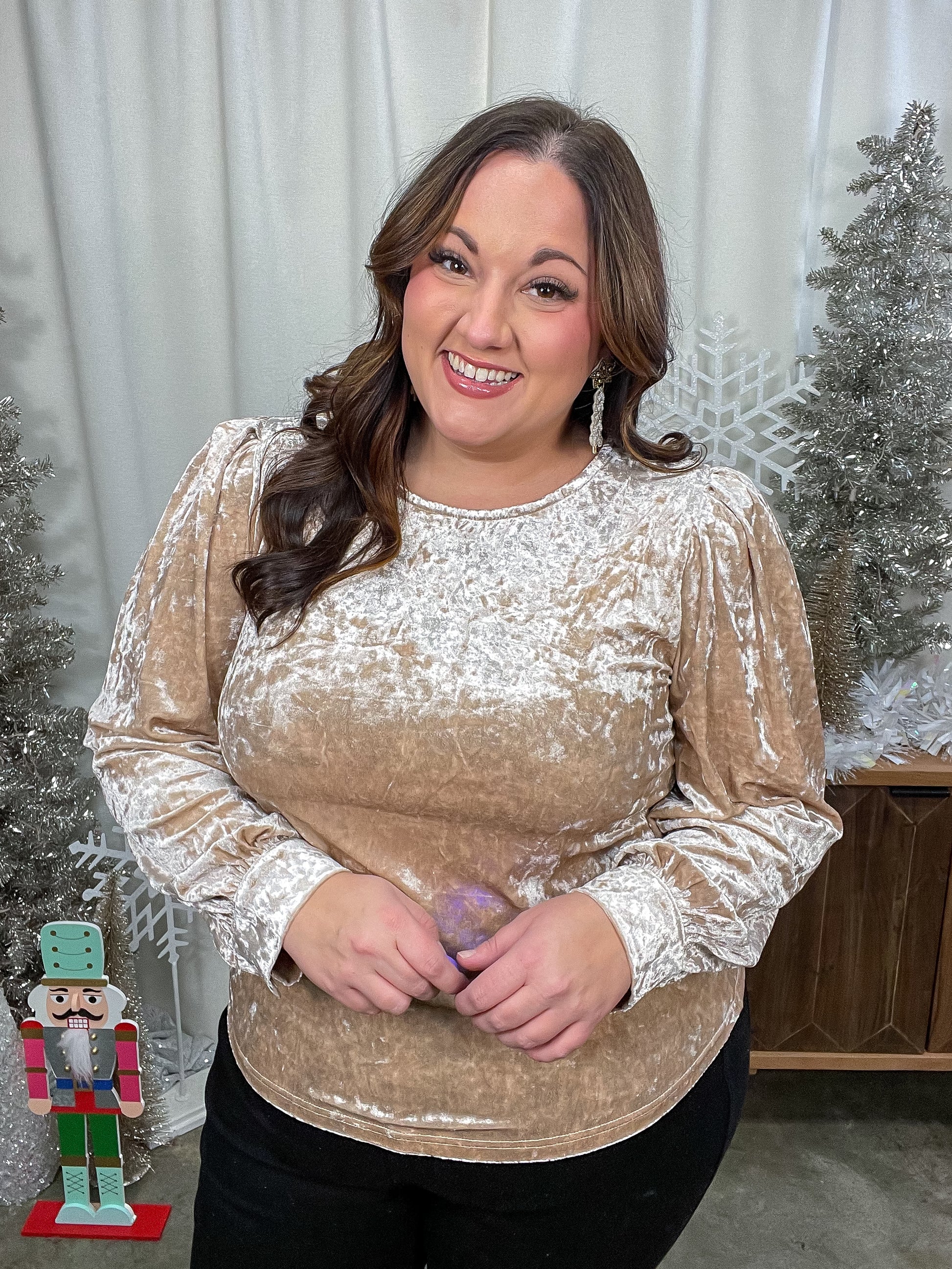 Introducing Feeling Good Velvet Blouse! This seasonal fashion must-have features puffed sleeves, a buttoned sleeve cuff, a keyhole button closure, and a round neckline in crushed velvet fabric for a luxe look. Enjoy a blend of comfort and style!