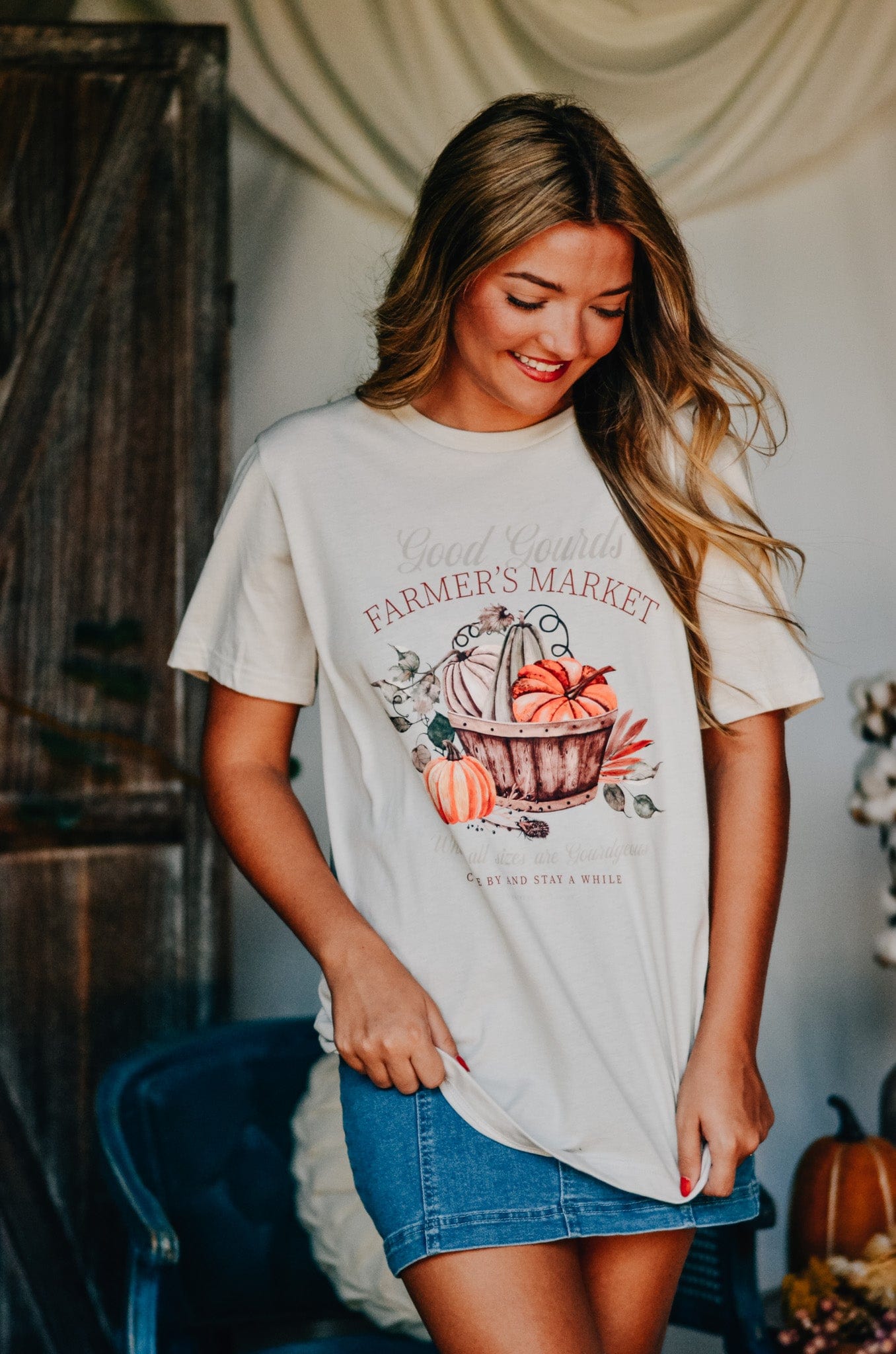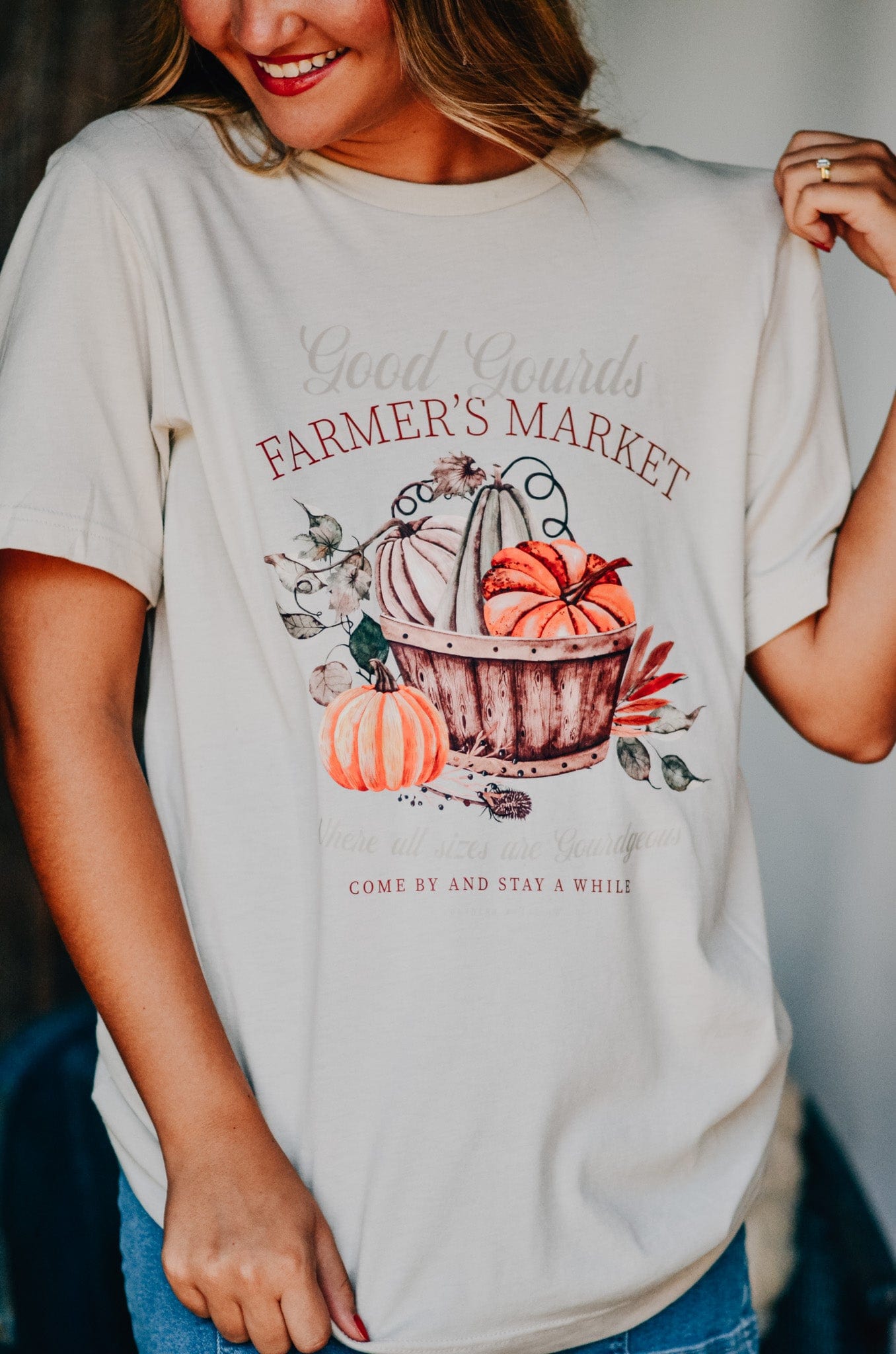 Pumpkin patch vibes, but make it wearable. The Good Gourds Farmer’s Market Tee features a cozy fall graphic with a vintage-style basket of pumpkins and gourds in soft, autumn tones. With phrases like “Come by and stay a while” and “These all sizes are gourdgeous,” it’s perfect for sipping cider, strolling local markets, or just soaking up sweater weather. Super soft and relaxed fit for all your favorite fall things.