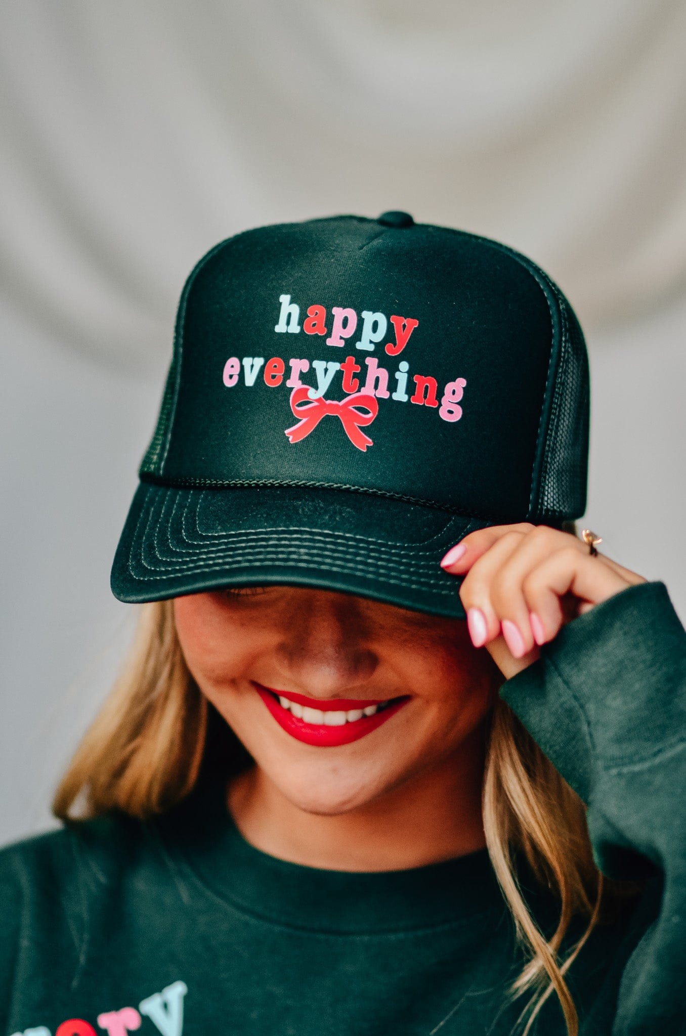 Spread good vibes in every season with the Happy Everything forrest green trucker hat. Featuring cheerful red, pink, and white lettering with a sweet bow detail, this cap is your reminder to celebrate life’s little moments—big or small.