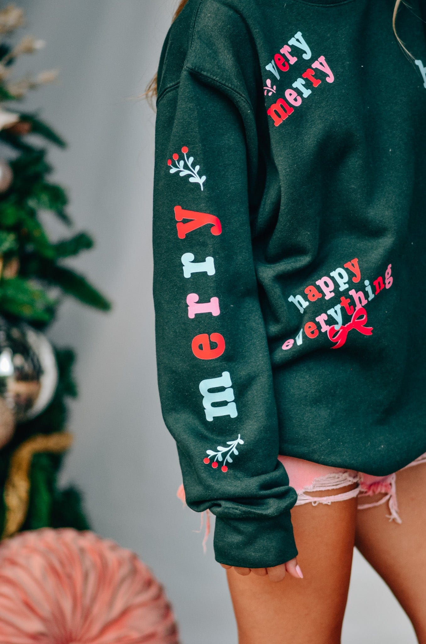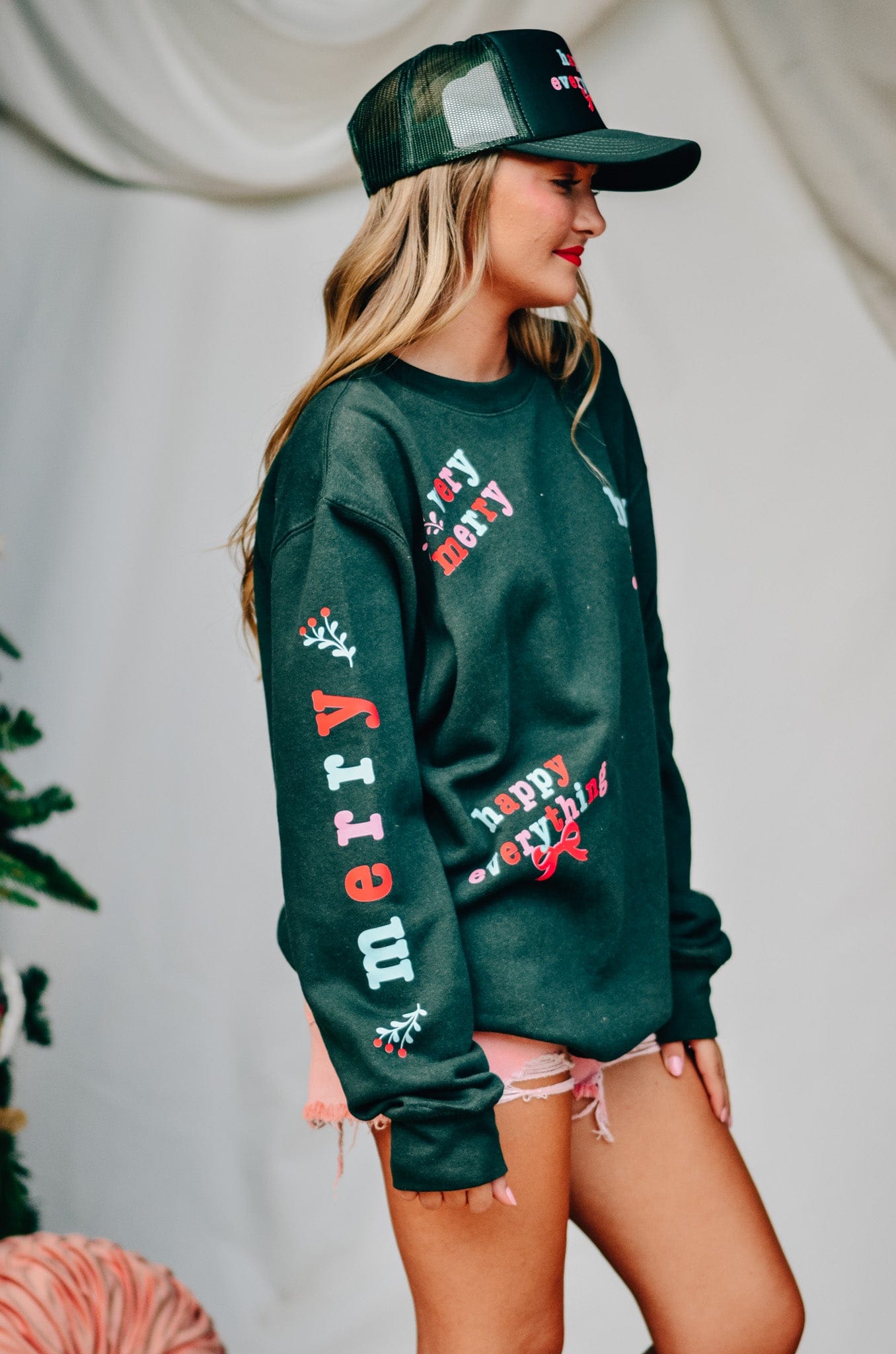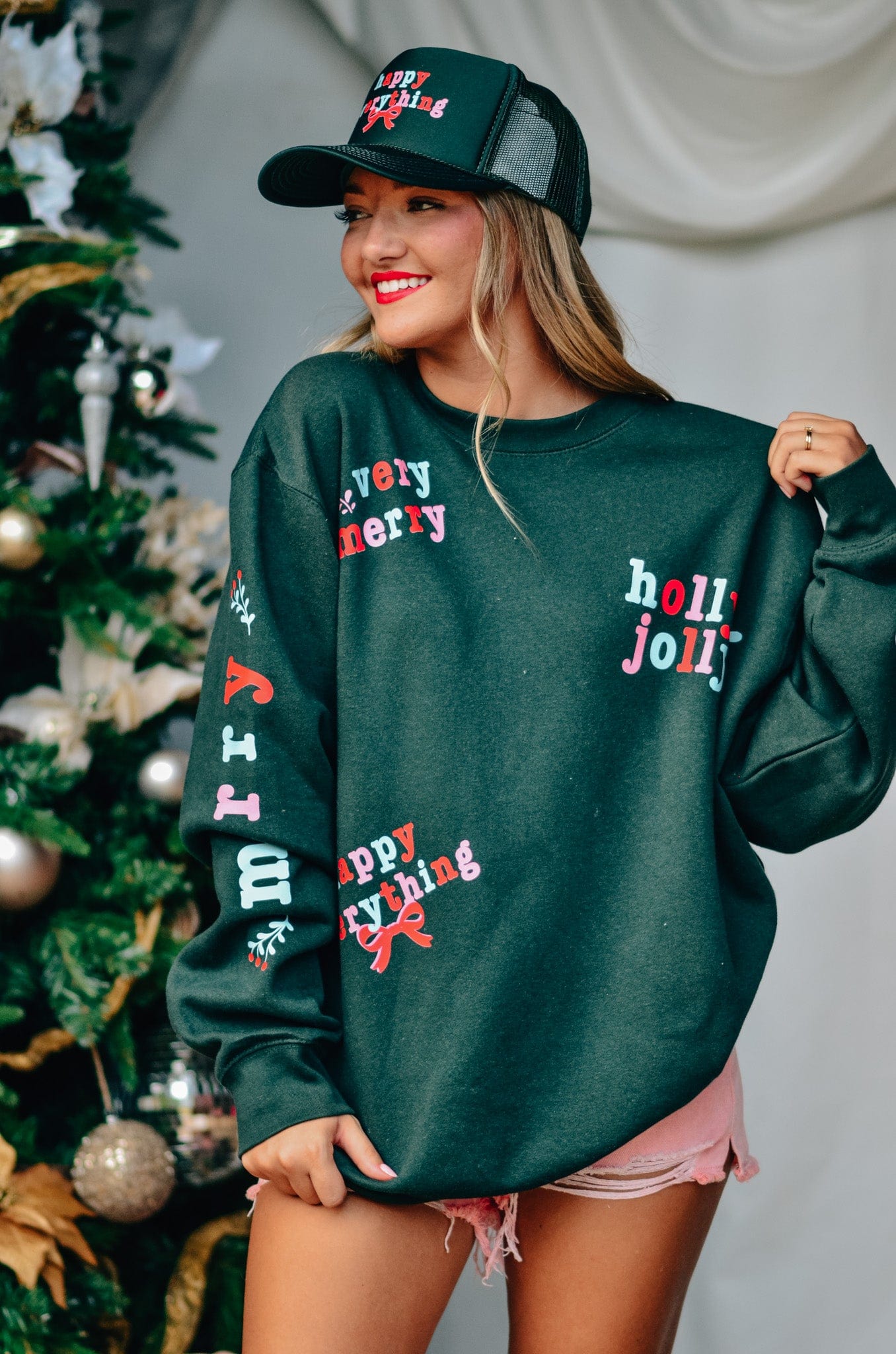 Say it all without saying a word. The Holly Merry Everything Forrest Sweatshirt brings together all your festive favorites in playful puff print on a cozy forest green fleece. From "very merry" to "happy everything," this oversized crew is perfect for spreading cheer (and looking cute while doing it). Cozy up, stand out, and keep the vibes merry all season long.