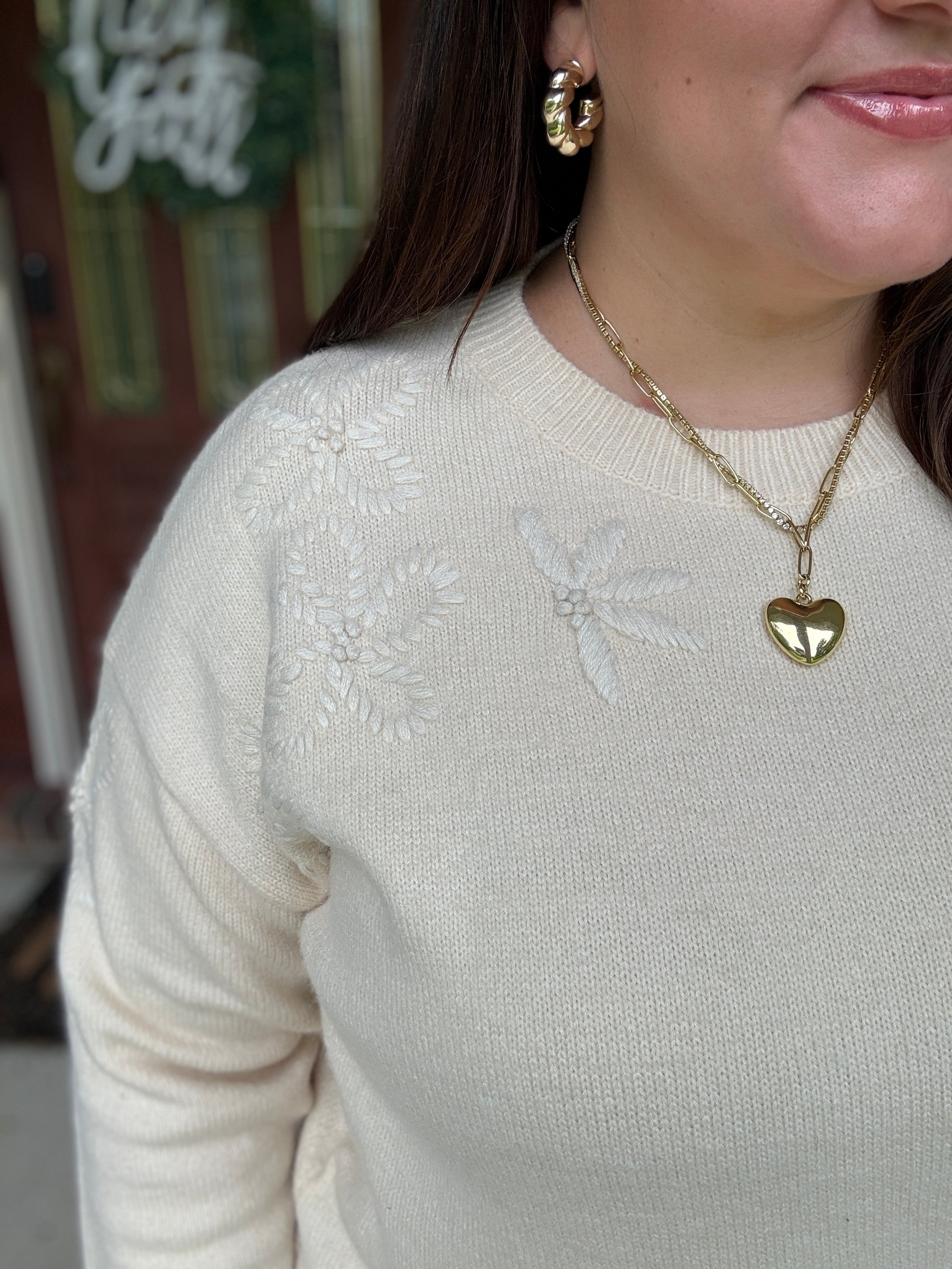 This sweater is such an easy go-to for cooler days. The soft, creamy beige color makes it super versatile — it pairs well with jeans, leggings, or even layered over a dress. What makes it special is the delicate embroidery along the shoulders and sleeves. It's subtle but really pretty up close, kind of like little stitched florals.