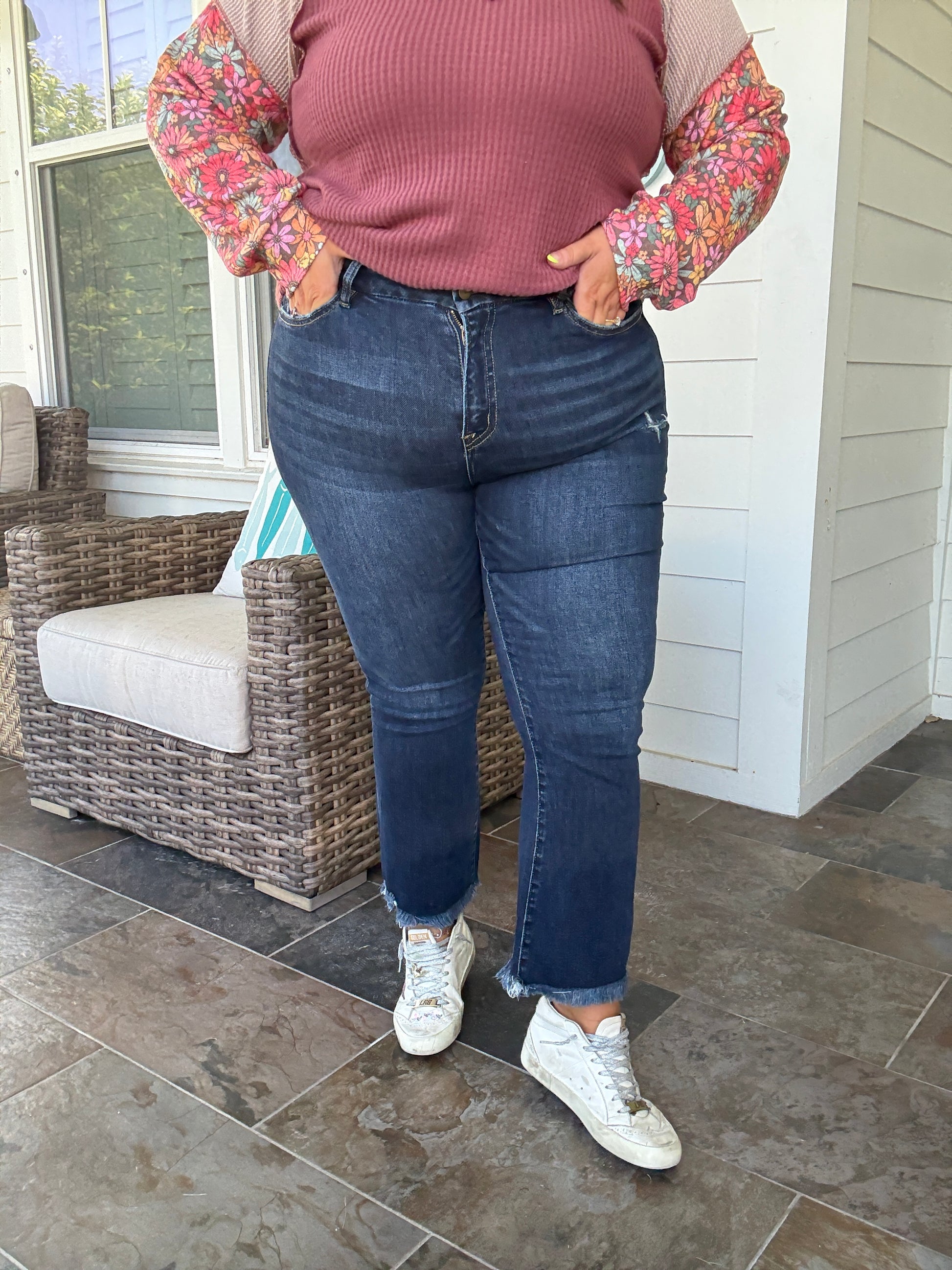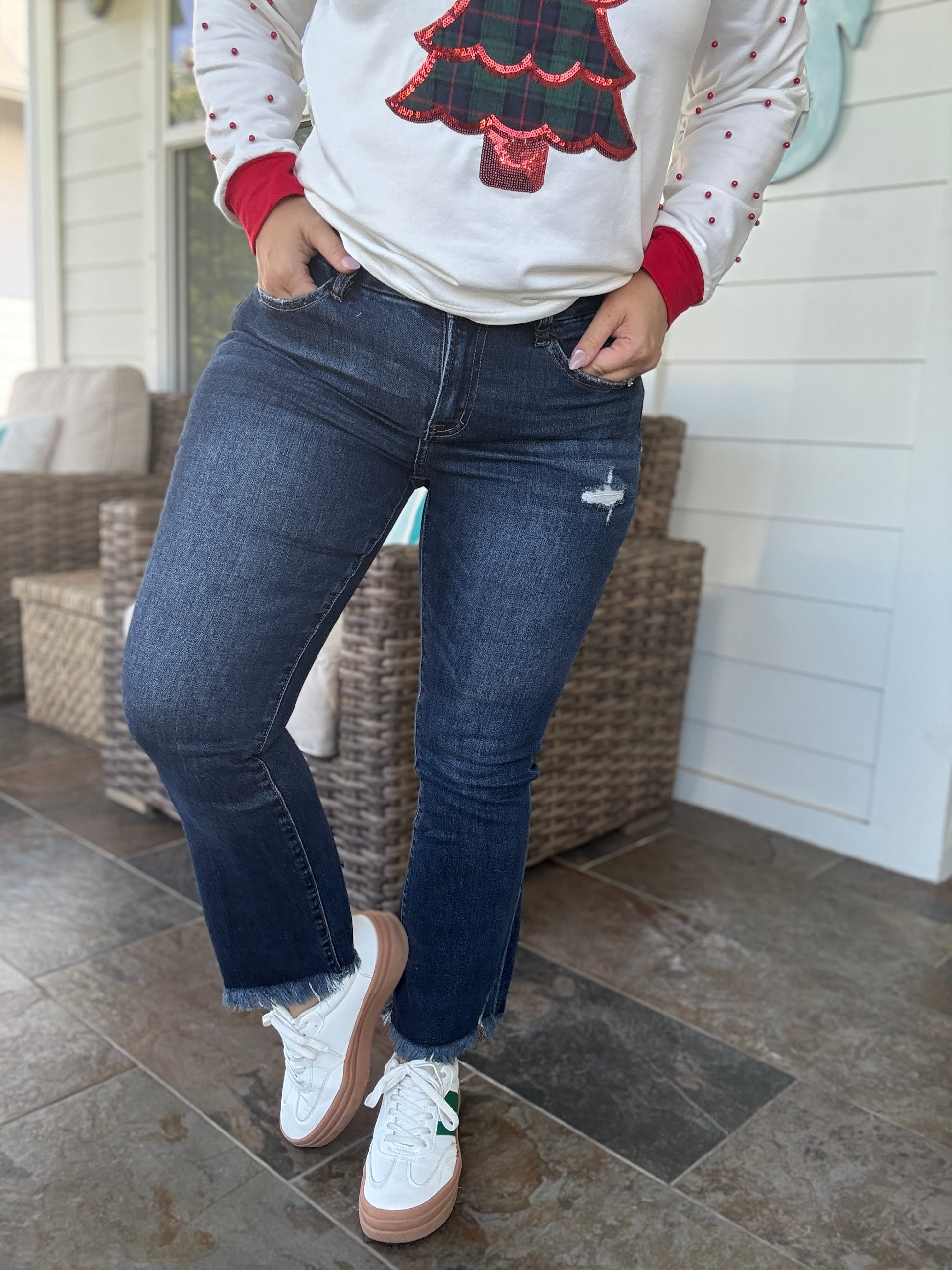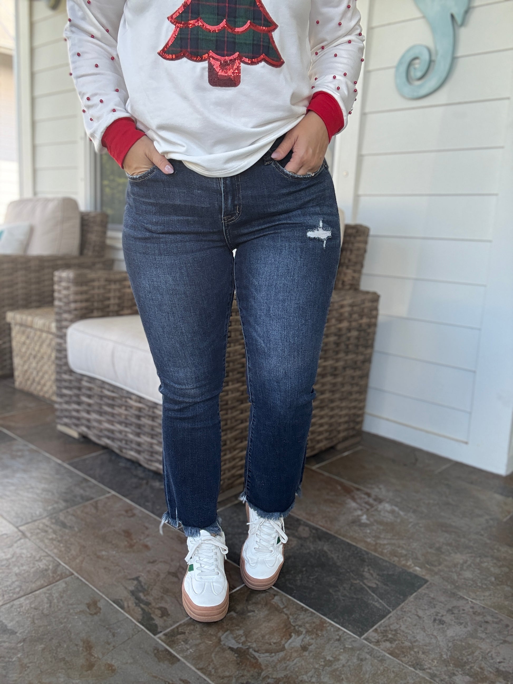 Helllooooo dark wash! š No holes in these cuties, one small distressed mark on the hip and a gorgeous dark wash that is flattering and great for fall! Crop length!
