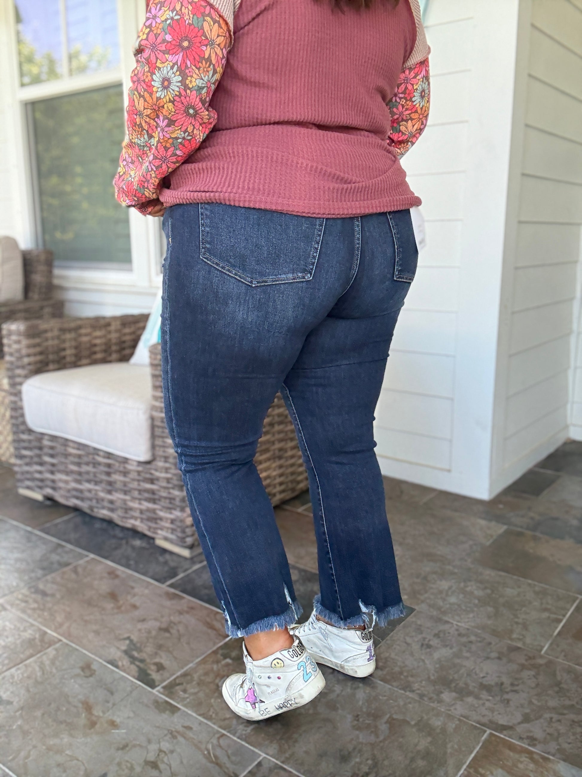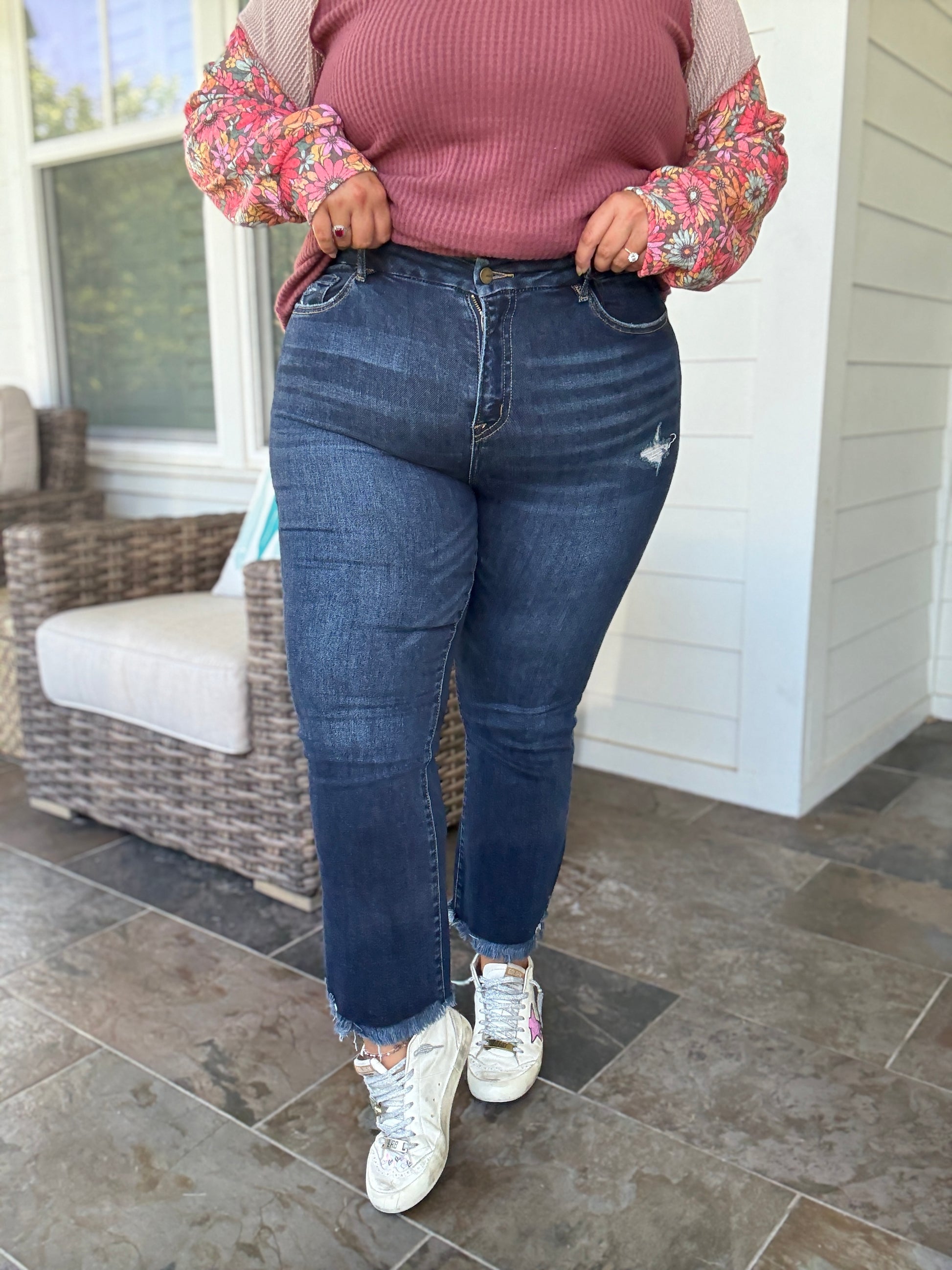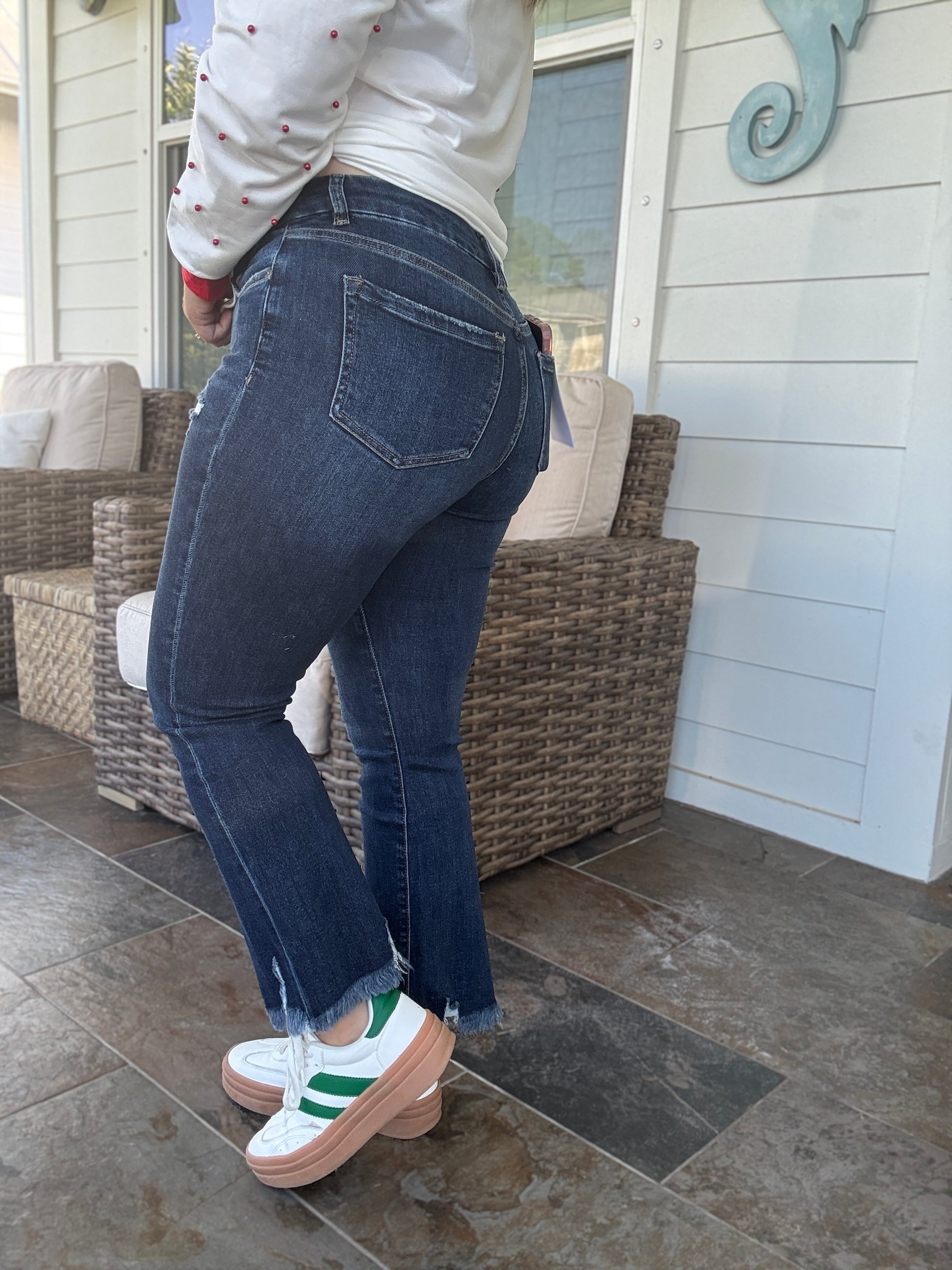 Helllooooo dark wash! š No holes in these cuties, one small distressed mark on the hip and a gorgeous dark wash that is flattering and great for fall! Crop length!